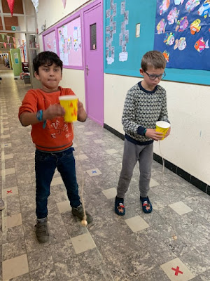Gaatje in de beker maken, touwtje door het gaatje steken en knoopje maken, kraaltje bevestigen aan het touwtje, touwtje niet te lang maken want hoe korter het touwtje ... hoe gemakkelijker straks om het kraaltje op te vangen !